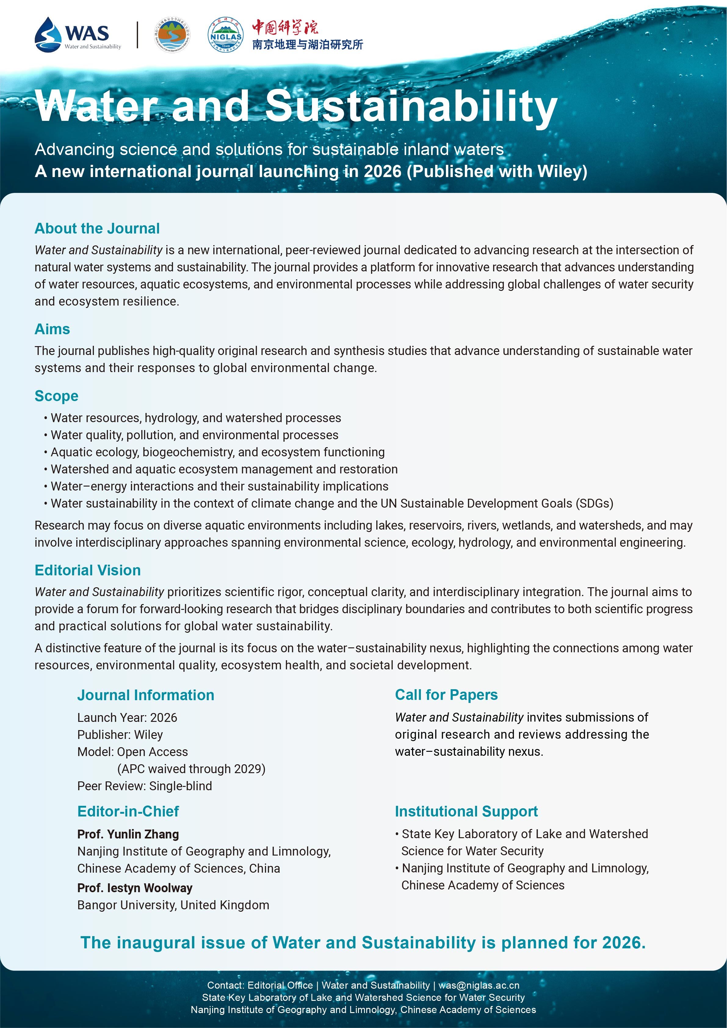 Water and Sustainability is a new international, peer-reviewed journal dedicated to advancing research at the intersection of natural water systems and sustainability. The journal provides a platform for innovative research that advances understanding of water resources, aquatic ecosystems, and environmental processes while addressing global challenges of water security and ecosystem resilience.